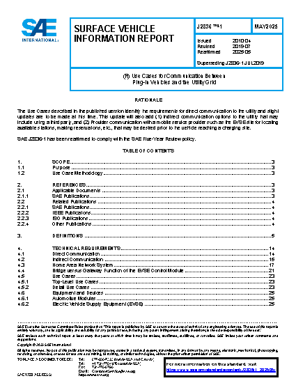 This SAE Information Report establishes Use Cases for communication between plug-in electric vehicles (PEVs) and the electric power grid, for energy transfer and other applications.