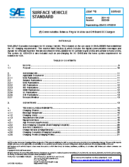 This SAE Recommended Practice establishes requirements and specifications for communication between plug-in electric vehicle (PEV) and the DC off-board charger. Where relevant, this document notes, but does not formally specify, interactions between the vehicle and vehicle operator.