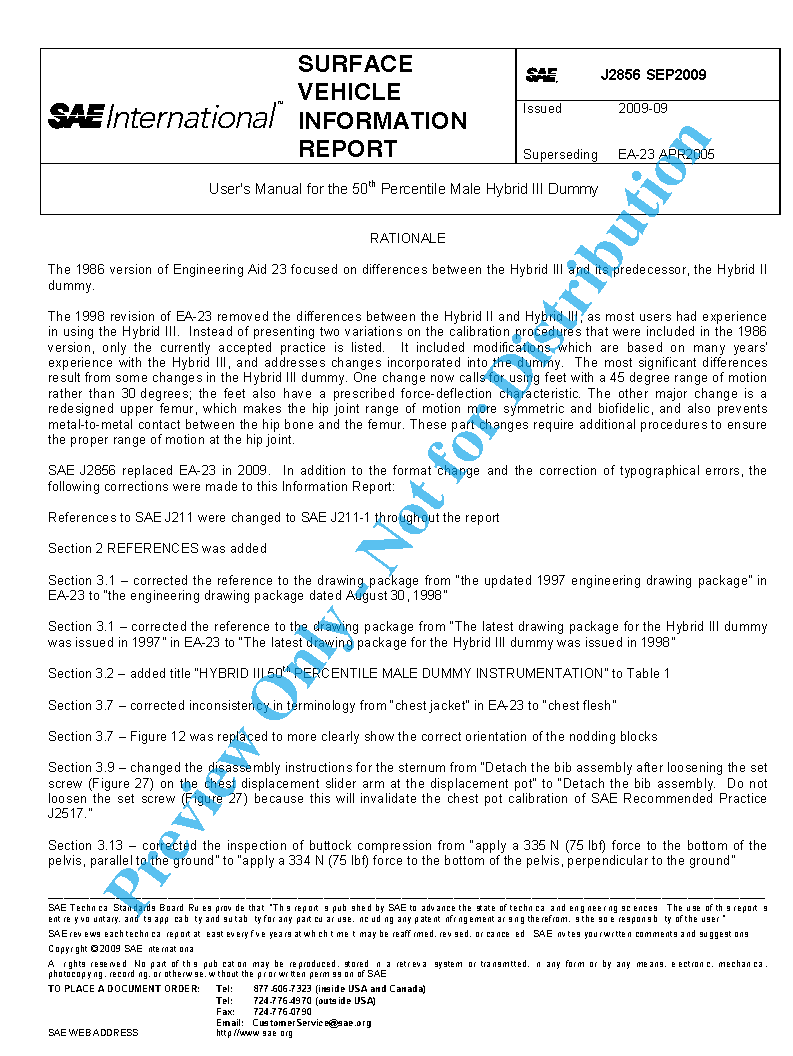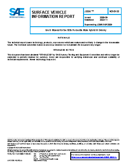 The purpose of this document is to provide the user with the procedures needed to properly assemble and disassemble the 50th percentile male Hybrid III dummy, certify its components and verify its mass and dimensions. Also within this manual are guidelines for handling accelerometers, repairing flesh and setting joints.