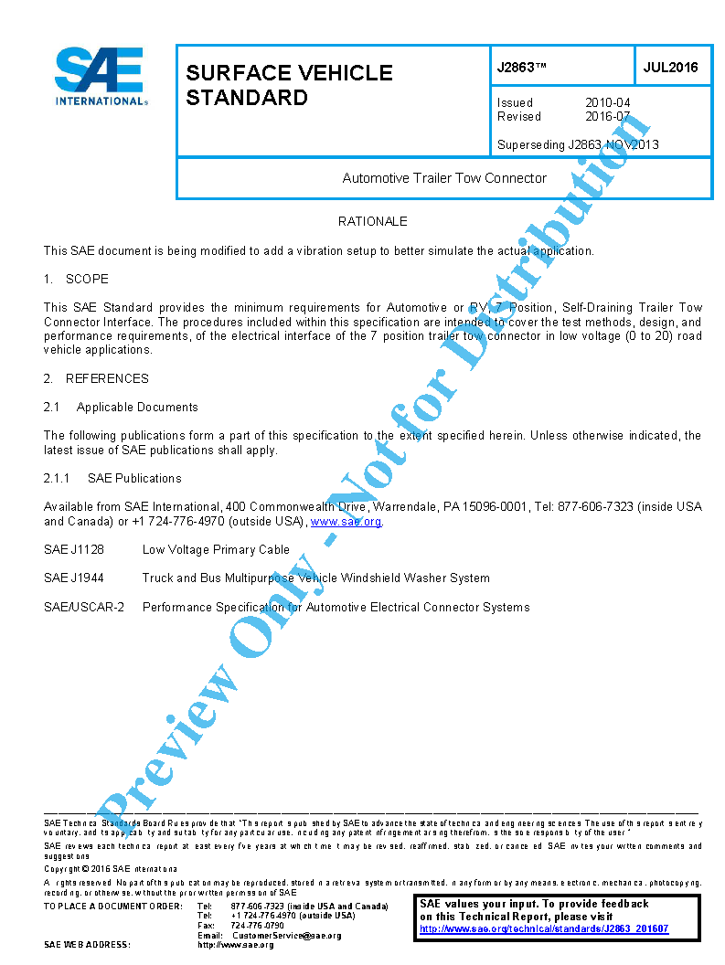 This SAE Standard provides the minimum requirements for automotive or RV, seven position, self-draining trailer tow connector interface. The procedures included within this specification are intended to cover the test methods, design, and performance requirements of the electrical interface of the seven-position trailer tow connector in low voltage (0 to 20) road vehicle applications.