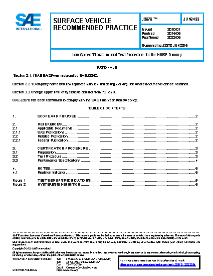 The intent of this document is to develop a low speed thorax certification procedure for the H-III5F dummy with a 3.0 m/s impact similar to the SAE J2779 procedure for the H-III50M dummy.