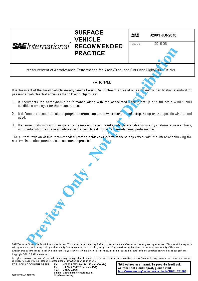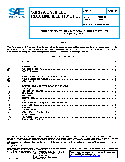 Use of and compliance with this Recommended Practice is voluntary; however, it is mandatory for those advertising or otherwise publishing aerodynamic performance as “measured according to SAE J2881.” Conversely, any advertised or otherwise published result carrying this or a substantially similar designation must have the necessary documentation accepted by and on file with the SAE in accordance with the procedures defined in this Recommended Practice.
