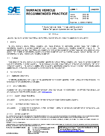 This SAE Standard covers fittings, couplers, and hoses intended for connecting service hoses from mobile air-conditioning systems to service equipment such as charging, recovery, and recycling equipment (see Figure 1). This specification covers service hose fittings and couplers for MAC service equipment service hoses, per SAE J2843 and SAE J2851, from mobile air-conditioning systems to service equipment such as manifold gauges, vacuum pumps, and air-conditioning charging, recovery, and recycling equipment.