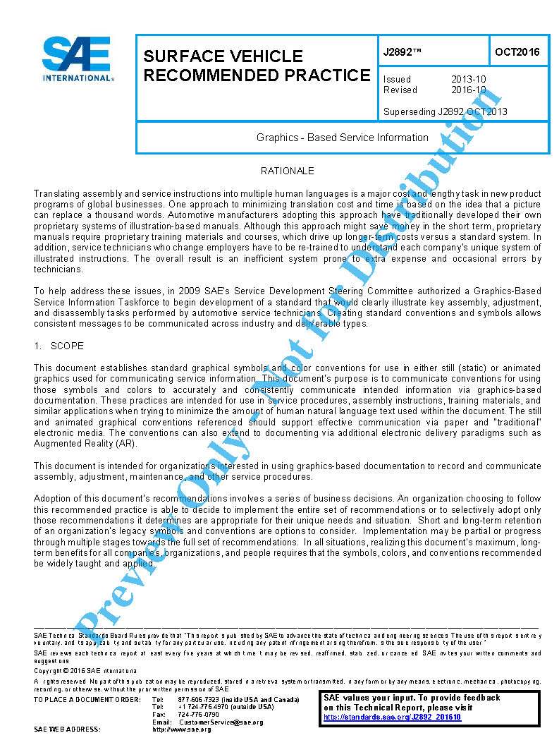 This document establishes standard graphical symbols and color conventions for use in either still (static) or animated graphics used for communicating service information. This document’s purpose is to communicate conventions for using those symbols and colors to accurately and consistently communicate intended information via graphics-based documentation. These practices are intended for use in service procedures, assembly instructions, training materials, and similar applications when trying to minimize the amount of human natural language text used within the document. The still and animated graphical conventions referenced should support effective communication via paper and “traditional” electronic media. The conventions can also extend to documenting via additional electronic delivery paradigms such as augmented reality (AR).