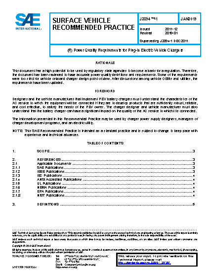 The intent of this document is to develop a recommended practice for PEV chargers, whether onboard or off-board the vehicle, that will enable equipment manufacturers, vehicle manufacturers, electric utilities, and others to make reasonable design decisions regarding power quality. The three main purposes are as follows: