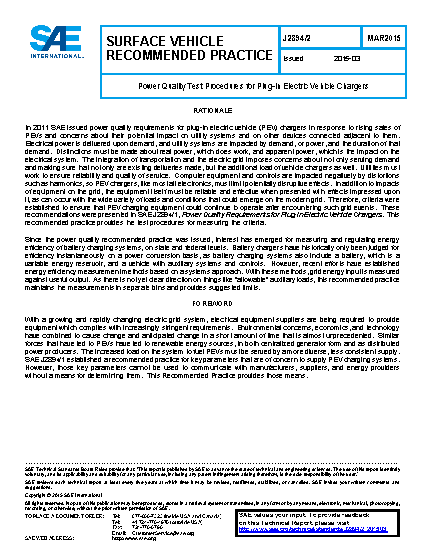 This recommended practice provides test procedures for evaluating PEV chargers for the parameters established in SAE J2894/1, Power Quality Requirements for Plug-In Electric Vehicle Chargers.