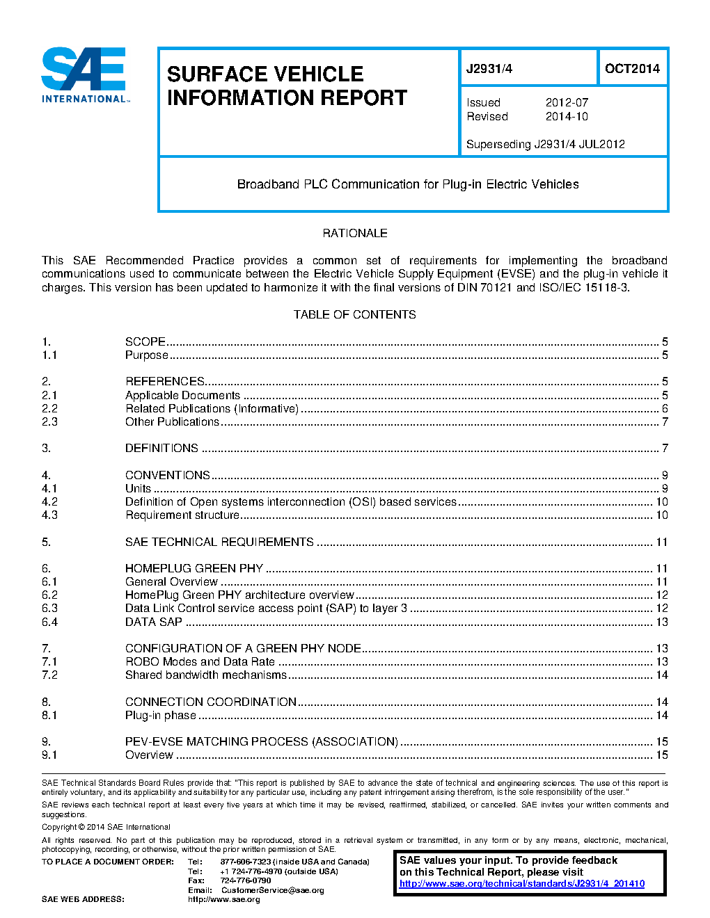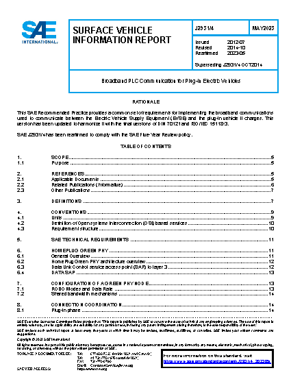 This SAE Technical Information Report SAE J2931/4 establishes the specifications for physical and data-link layer communications using broadband Power Line Communications (PLC) between the plug-In electric vehicle (PEV) and the electric vehicle supply equipment (EVSE) DC off-board-charger. This document deals with the specific modifications or selection of optional features in HomePlug Green PHY v1.1 (HomePlug GP1.1) necessary to support the automotive charging application over Control Pilot lines as described in SAE J1772™. PLC may also be used to connect directly to the Utility smart meter or home area network (HAN), and may technically be applied to the AC mains, both of which are outside the scope of this document.