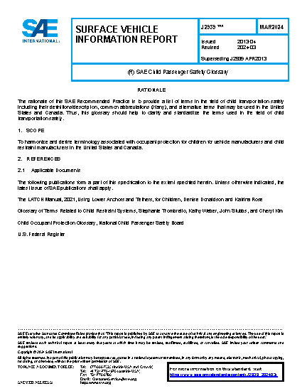 The rationale of this SAE recommended practice SAE J2939 is to provide a list of terms in the field of child transportation safety including their definitions/description, their common abbreviations (if any), and mandated regulatory Standards (where applicable). Thus, this glossary should help to clarify and standardize the terms used in the field of child transportation safety