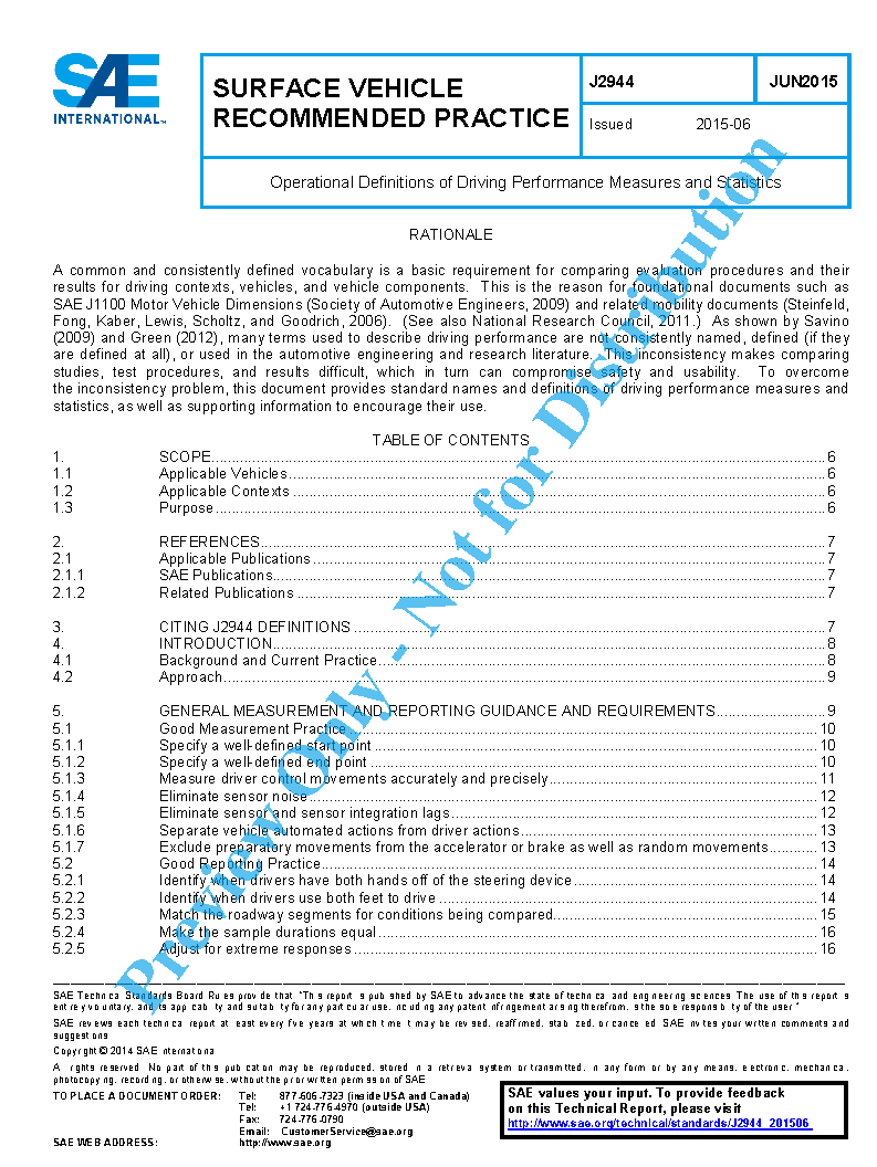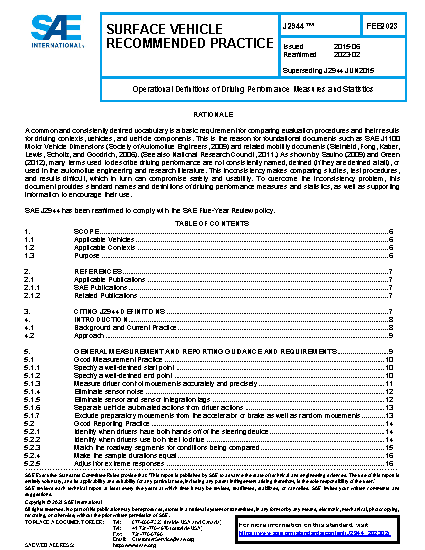 This Recommended Practice, Operational Definitions of Driving Performance Measures and Statistics, provides functional definitions of and guidance for performance measures and statistics concerned with driving on roadways. As a consequence, measurements and statistics will be calculated and reported in a consistent manner in SAE and ISO standards, journal articles proceedings papers, technical reports, and presentations so that the procedures and results can be more readily compared. Only measures and statistics pertaining to driver/vehicle responses that affect the lateral and longitudinal positioning of a road vehicle are currently provided in this document. Measures and statistics covering other aspects of driving performance may be included in future editions. For eye glance-related measures and statistics, see SAE J2396 (Society of Automotive Engineers, 2007) and ISO 15007-1 (International Standards Organization, 2002).