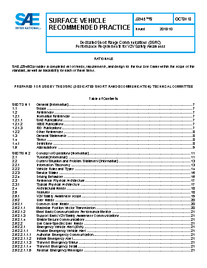 This SAE Document specifies DSRC interface requirements for V2V Safety Awareness applications, including detailed Systems Engineering documentation (needs and requirements mapped to appropriate message exchanges). These applications include: Emergency Vehicle Alert, Roadside Alert, and Safety Awareness Alerts for Objects and Adverse Road Conditions. This document extends the V2V Communications capabilities defined in J2945/1 to support these applications, and the National ITS Architecture. The purpose of this SAE Document is to enable interoperability for V2V Safety Awareness communications.