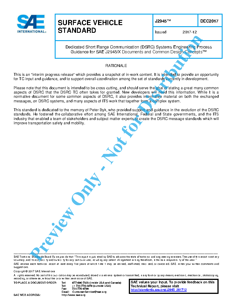 This SAE Standard serves as the guidance document for the J2945/x family of standards as illustrated in Figure 7. It contains cross-cutting material which applies to the other J2945/x standards, including recommended practice for the use of Systems Engineering (SE) and generic DSRC interface requirements content.