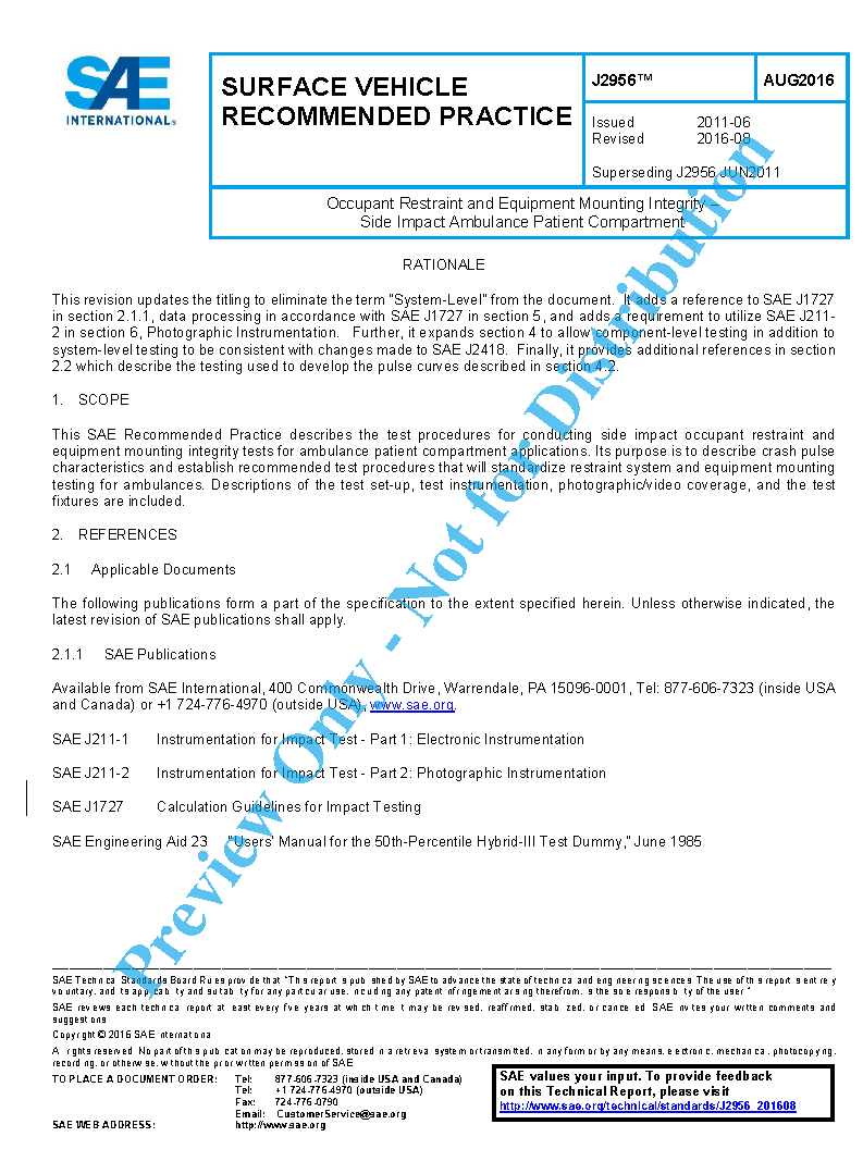 This SAE Recommended Practice describes the test procedures for conducting side impact occupant restraint and equipment mounting integrity tests for ambulance patient compartment applications. Its purpose is to describe crash pulse characteristics and establish recommended test procedures that will standardize restraint system and equipment mounting testing for ambulances. Descriptions of the test set-up, test instrumentation, photographic/video coverage, and the test fixtures are included.