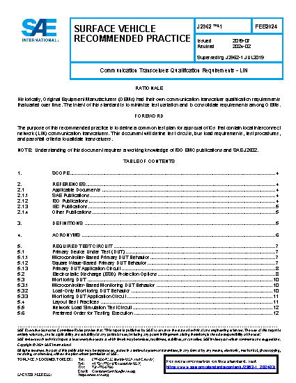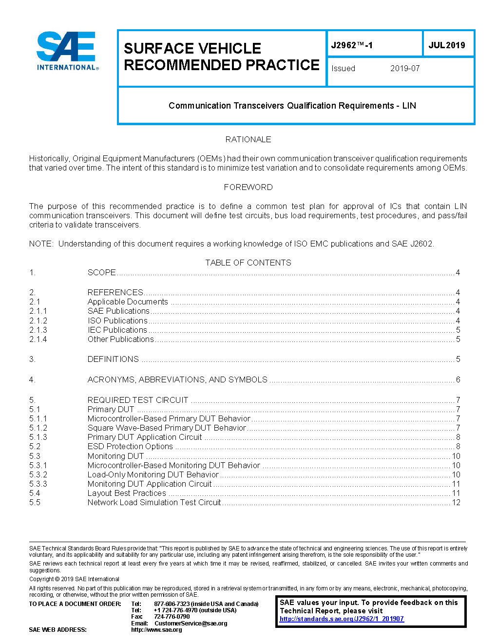 The goal of SAE J2962-1 is to commonize approval processes of LIN transceivers across OEMs.