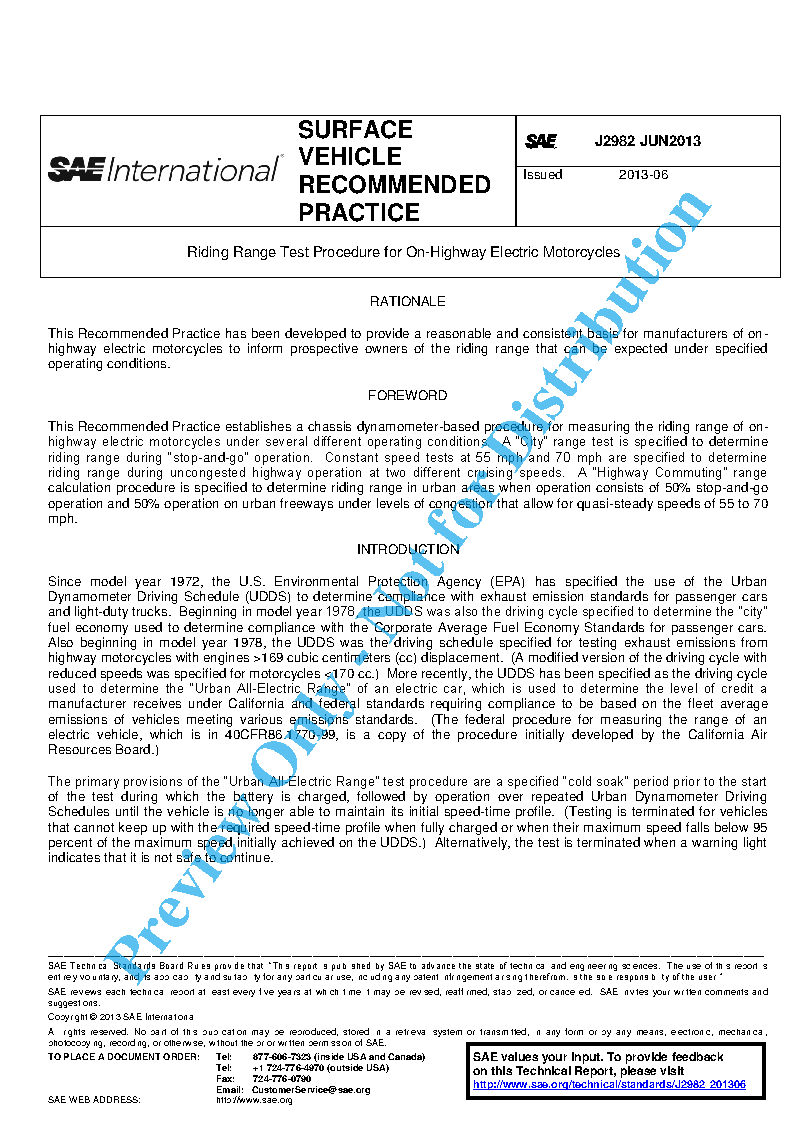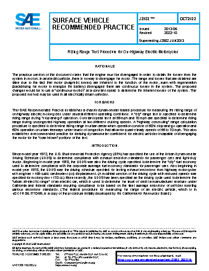 This SAE Recommended Practice incorporates dynamometer test procedures that produce riding range estimates for electric motorcycles during stop-and-go urban riding on surface streets and commuting trips in urban areas that include operation on freeways.