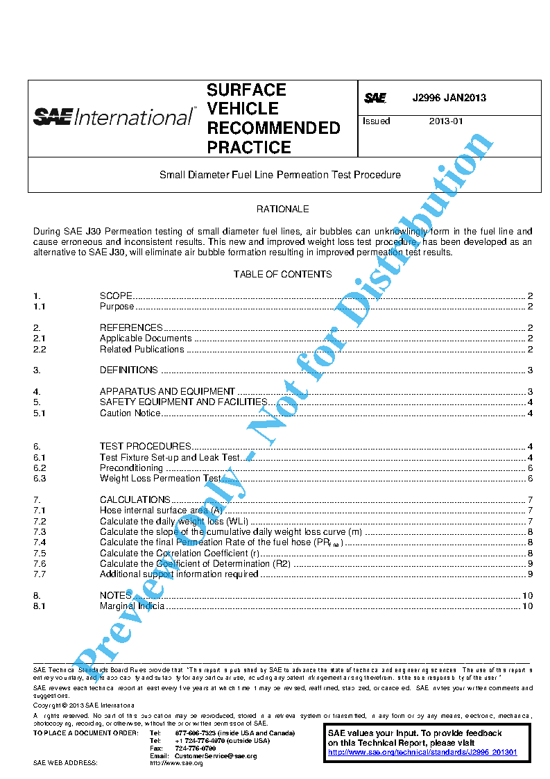 This SAE Recommended Practice is intended for the determination of the losses of hydrocarbon fluids by permeation through small diameter fuel hose typically 4.75mm ID or less and typically used on Small Off-Road Engines (SORE) less than 19 kW as regulated under 40 CFR Part 1054.