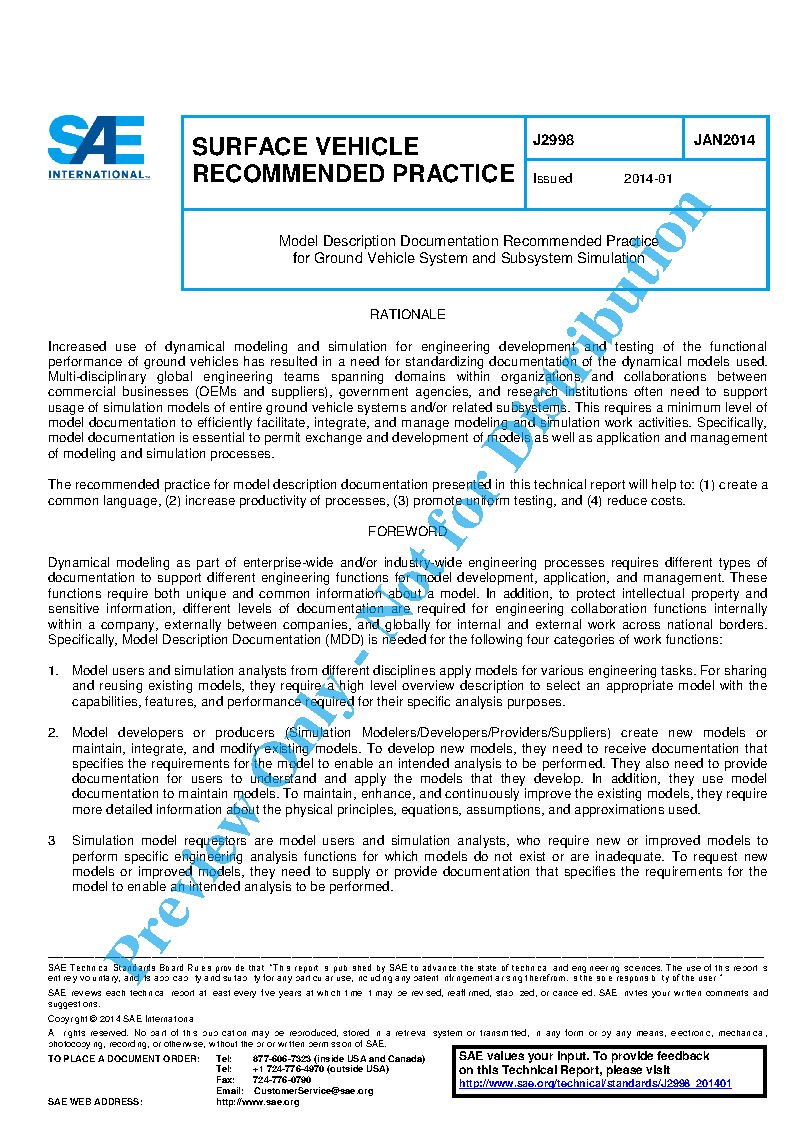 The Model Description Documentation Recommended Practice for Ground Vehicle System and Subsystem Simulation defines the recommended information content to be included for documenting dynamical models used for simulation of ground vehicle systems. It describes the information that should be compiled to describe a model for the following user applications or use cases: (1) exchange, promotion, and selection; (2) creation requests; (3) development process management; (4) compatibility evaluation, (5) testing-in-the-loop simulations with hardware and/or software; (6) simulation applications; and (7) development and maintenance. For each use case, a Model Description Documentation (MDD) template is provided in the appendices to facilitate model documentation. In addition, an example of a completed model documentation template is provided in the appendices.