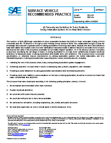 This document describes [motor] vehicle driving automation systems that perform part or all of the dynamic driving task (DDT) on a sustained basis. It provides a taxonomy with detailed definitions for six levels of driving automation, ranging from no driving automation (Level 0) to full driving automation (Level 5), in the context of [motor] vehicles (hereafter also referred to as “vehicle” or “vehicles”) and their operation on roadways: