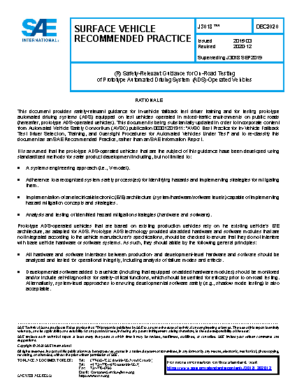 This document provides safety-relevant guidance for on-road testing of vehicles being operated by prototype conditional, high, and full (Levels 3 to 5) ADS, as defined by SAE J3016. It does not include guidance for evaluating the performance of post-production ADS-equipped vehicles. Moreover, this guidance only addresses testing of ADS-operated vehicles as overseen by in-vehicle fallback test drivers (IFTD).