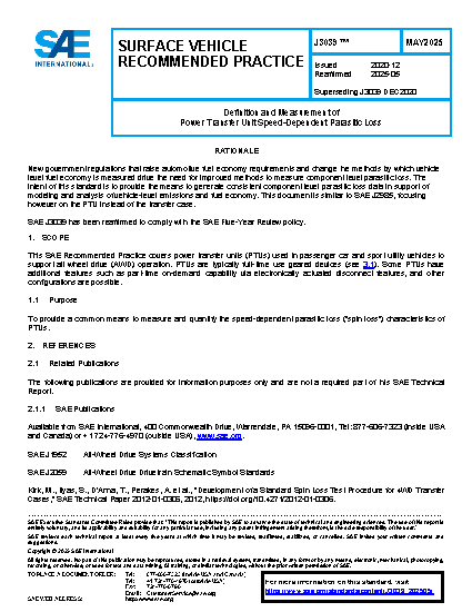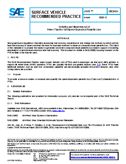 This SAE Recommended Practice covers power transfer units (PTUs) used in passenger car and sport utility vehicles to support all wheel drive (AWD) operation. PTUs are typically full-time use geared devices (see 3.1). Some PTUs have additional features such as part-time on-demand capability via electronically actuated disconnect features, and other configurations are possible.