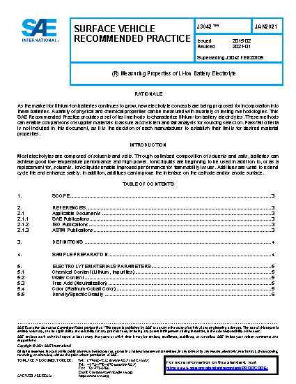 This SAE Recommended Practice provides a set of test methods for characterizing lithium-ion battery electrolytes. These test methods are applicable to existing electrolyte materials and allow different facilities to conduct testing in a common manner.