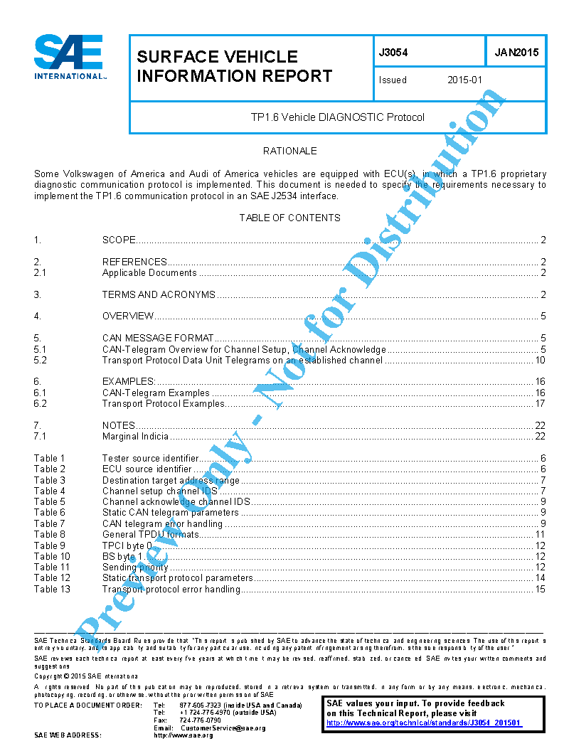 Some Volkswagen of America and Audi of America vehicles are equipped with ECU(s), in which a TP1.6 proprietary diagnostic communication protocol is implemented. The purpose of this document is to specify the requirements necessary to implement the communication protocol in an SAE J2534 interface.