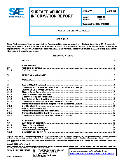 This Technical Information Report defines the diagnostic communication protocol TP1.6. This document should be used in conjunction with SAE J2534-2 in order to fully implement the communication protocol in an SAE J2534 interface.