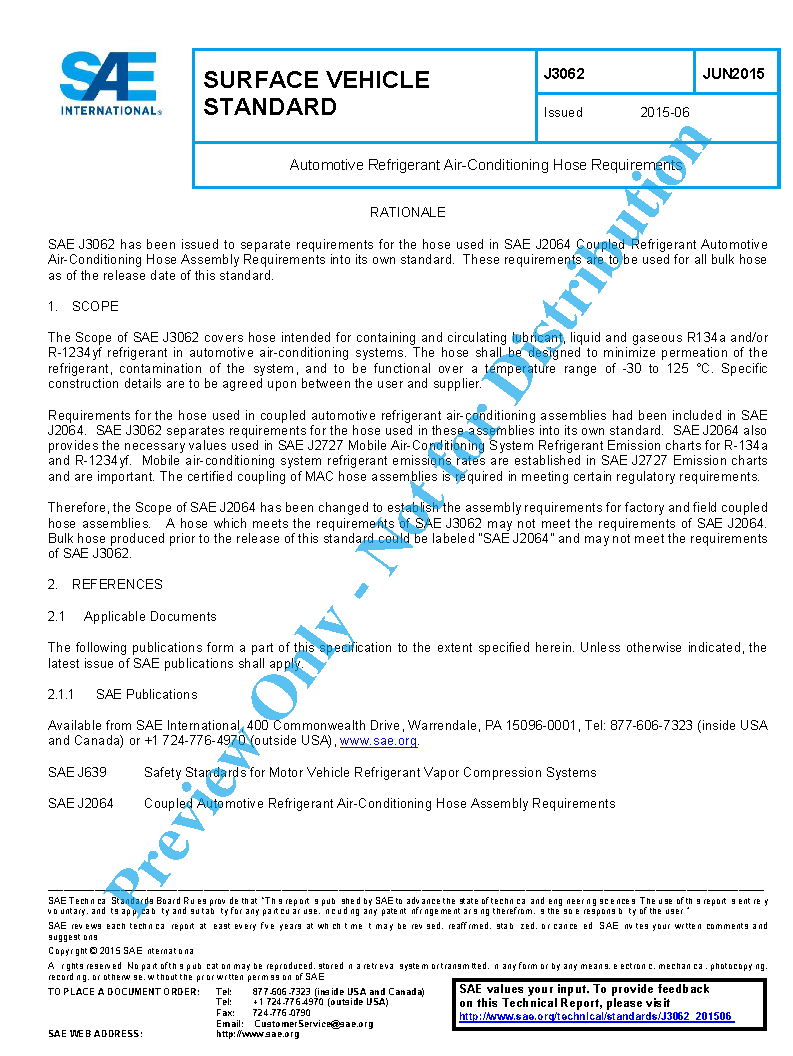 Requirements for the hose used in coupled automotive refrigerant air-conditioning assemblies are included in SAE J2064. SAE J3062 separates requirements for the hose used in these assemblies into its own standard. SAE J2064 also provides the necessary refrigerant permeation values used in SAE J2727. Mobile air-conditioning system refrigerant emissions rates are established in SAE J2727 emission charts and are important. The certified coupling of MAC hose assemblies is required in meeting certain regulatory requirements.