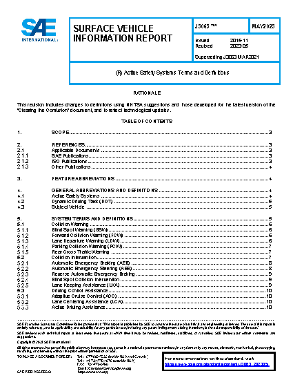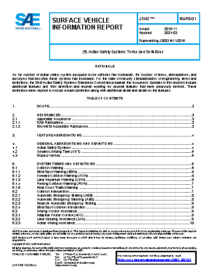 This SAE Information Report provides a compendium of terms, definitions, abbreviations, and acronyms to enable common terminology for use in engineering reports, diagnostic tools, and publications related to active safety systems. This information report is a survey of active safety systems and related terms. The definitions offered are descriptions of functionality rather than technical specifications. Included are warning and momentary intervention systems, which do not automate any part of the dynamic driving task (DDT) on a sustained basis (SAE Level 0 as defined in SAE J3016), as well as definitions of select features that perform part of the DDT on a sustained basis (SAE Level 1 and 2).