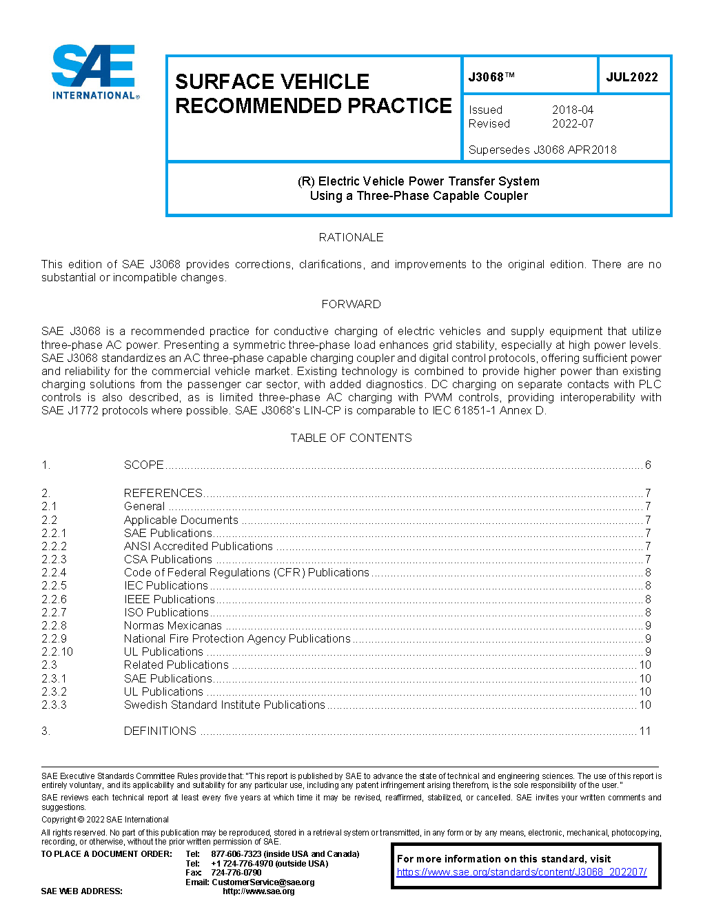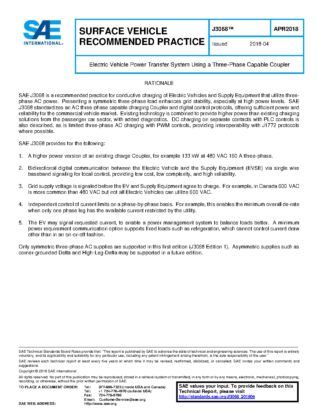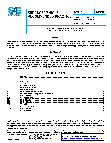 This document covers the general physical, electrical, functional, testing, and performance requirements for conductive power transfer to an electric vehicle using a coupler capable of, but not limited to, transferring three-phase AC power. It defines a conductive power transfer method including the digital communication system. It also covers the functional and dimensional requirements for the electric vehicle inlet, supply equipment connector, and mating housings and contacts. Moveable charging equipment such as a service truck with charging facilities are within scope. Charging while moving (or in-route-charging) is not in scope.