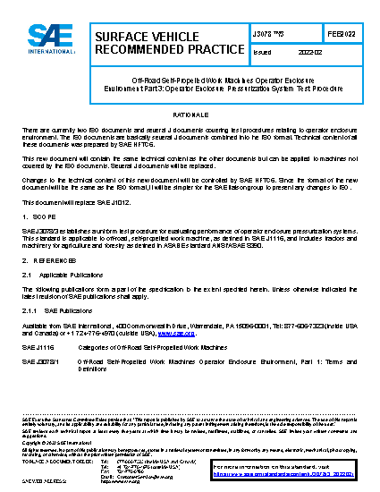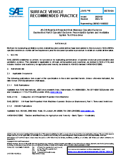 SAE J3078/3 establishes a uniform test procedure for evaluating performance of operator enclosure pressurization and ventilation systems. This standard is applicable to off-road, self-propelled work machines, as defined in SAE J1116, and includes tractors and machinery for agriculture and forestry as defined in ASABE standard ANSI/ASAE S390.
