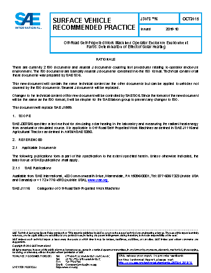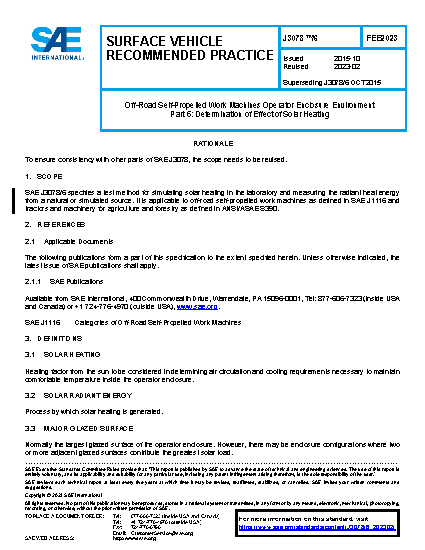 SAE J3078/6 specifies a test method for simulating solar heating in the laboratory and measuring the radiant heat energy from a natural or simulated source. It is applicable to Off-Road Self-Propelled Work Machines as defined in SAE J1116 and Agricultural Tractors as defined in ANSI/ASAE S390.