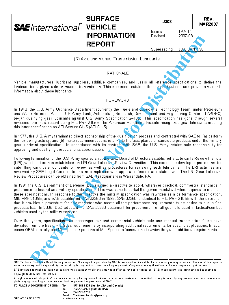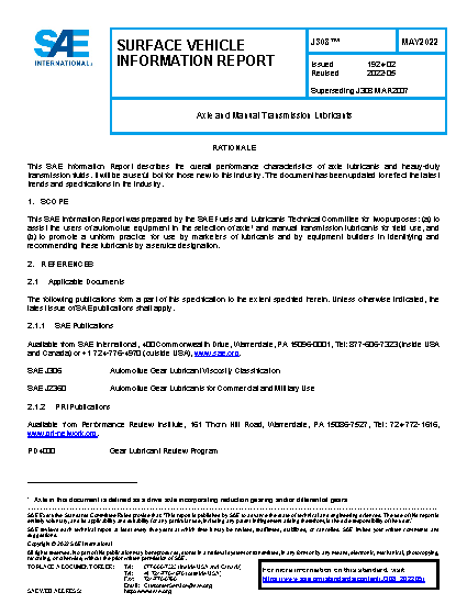 This SAE Information Report was prepared by the SAE Fuels and Lubricants Technical Committee for two purposes: (a) to assist the users of automotive equipment in the selection of axle 1 and manual transmission lubricants for field use, and (b) to promote a uniform practice for use by marketers of lubricants and by equipment builders in identifying and recommending these lubricants by a service designation.