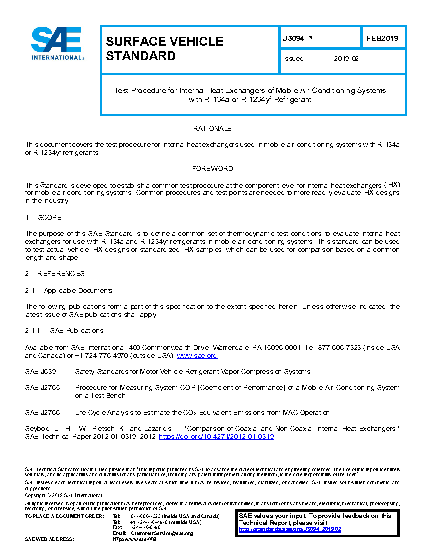 The purpose of this SAE Standard is to define a common set of thermodynamic test conditions to evaluate internal heat exchangers for use with R-134a and R-1234yf refrigerants in mobile air-conditioning systems. This SAE Standard can be used to test actual vehicle IHX designs or standardized IHX samples, which can be used for comparison based on a common length and shape.