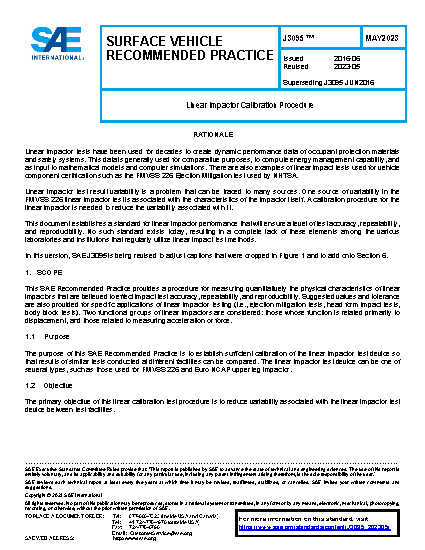 This recommended practice provides a procedure for measuring quantitatively the physical characteristics of linear impactors that are believed to effect impact test accuracy, repeatability, and reproducibility. Suggested values and tolerance are also provided for specific applications of linear impactor testing (i.e. Ejection Mitigation tests, Head form Impact tests, Body Block tests). Two functional groups of linear impactors are considered, those whose function is related primarily to displacement and those related to measuring acceleration or force.