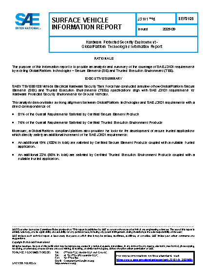 The scope of the analysis is on the GlobalPlatform Secure Element (SE) and Trusted Execution Environment (TEE) standard specifications correspondence to SAE J3101 recommended practices. This analysis includes focuses on the platform specifications but not the scope of any future security application/applets. Both of these GlobalPlatform specifications have associated protection profiles to validate compliance, although GlobalPlatform does not currently have any specific SAE J3101 protection profiles. GlobalPlatform has communicated that it is assessing whether or not to develop application-level protection profiles to more explicitly cover the remaining requirements of SAE J3101 in order to allow for standardized testing and certification of complete solutions.