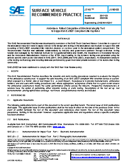 This SAE Recommended Practice describes the dynamic and static testing procedures required to evaluate the integrity of the ambulance substructure, to support the safe mounting of an SAE J3027 compliant litter retention device or system, when exposed to a frontal, side or rear impact (i.e., a crash impact). Its purpose is to provide manufacturers, ambulance builders, and end-users with testing procedures and, where appropriate, acceptance criteria that to a great extent ensure the ambulance substructure meets the same performance criteria across the industry. Prospective manufacturers or vendors have the option of performing either dynamic testing or static testing. Descriptions of the test set-up, test instrumentation, photographic/video coverage, test fixture, and performance metrics are included.