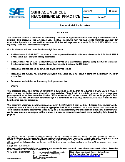 This procedure provides a method of determining a benchmark SgRP position for adjustable Driver’s seats in Class A vehicles where the design intent information is not available. Class A vehicles include passenger cars, multipurpose passengervehicles, and vans with Seat Heights (H30) greater than 127 mm and less than 405 mm for the purposes of this document. Once the Driver’s Seat Benchmark SgRP is determined other seating positions can be readily benchmarked based on the standard procedures.
