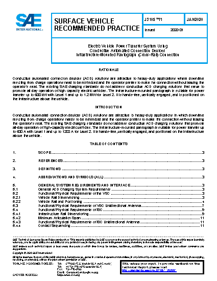 This document covers the connection interface relevant requirements for an electric vehicle power transfer system using a conductive automated connection device (ACD) based on a cross-rail design. To allow interoperability for on-road vehicles (in particular, buses and coaches), one configuration is described in this document. Other configurations may be used for non-standard applications (for example, mining trucks or port vehicles).