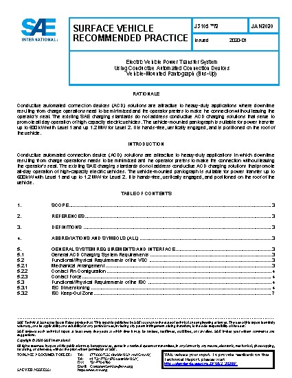 This document details one of the connections of the SAE J3105 document. The connections are referenced in the scope of the main document SAE J3105. SAE J3105/2 details the vehicle-mounted pantograph, or the bus-up connection. All the common requirements are defined in the main document; the current document provides the details of the connection.