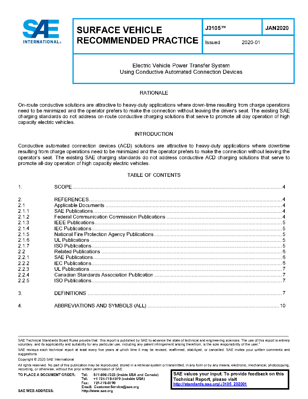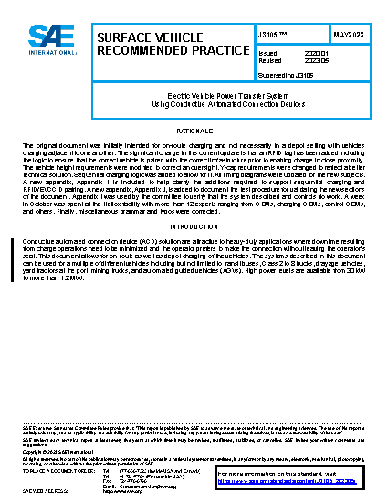 This document covers the general physical, electrical, functional, testing, and performance requirements for conductive power transfer, primarily for vehicles using a conductive ACD connection capable of transferring DC power. It defines conductive power transfer methods, including the infrastructure electrical contact interface, the vehicle connection interface, the electrical characteristics of the DC supply, and the communication system. It also covers the functional and dimensional requirements for the vehicle connection interface and supply equipment interface. There are also sub-documents which are identified by a SAE J3105/1, SAE J3105/2, and SAE J3105/3. These will be specific requirements for a specific interface defined in the sub-document.