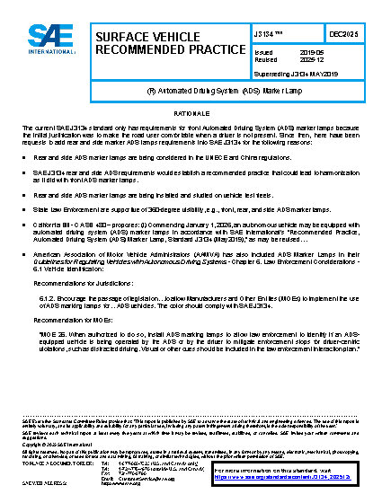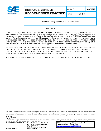 This SAE Recommended Practice provides guidelines for the use, performance, installation, activation, and switching of marking lamps on Automated Driving System (ADS) equipped vehicles.