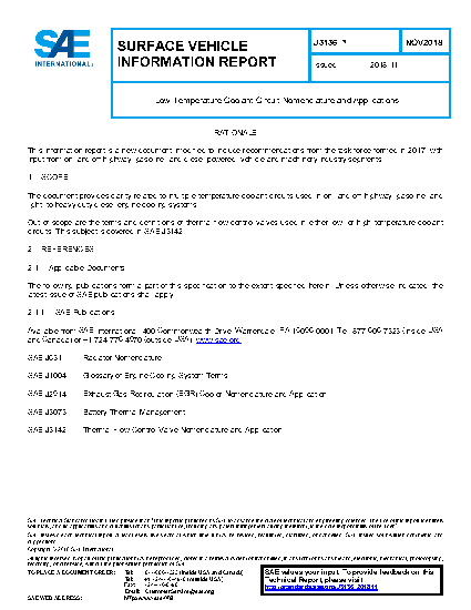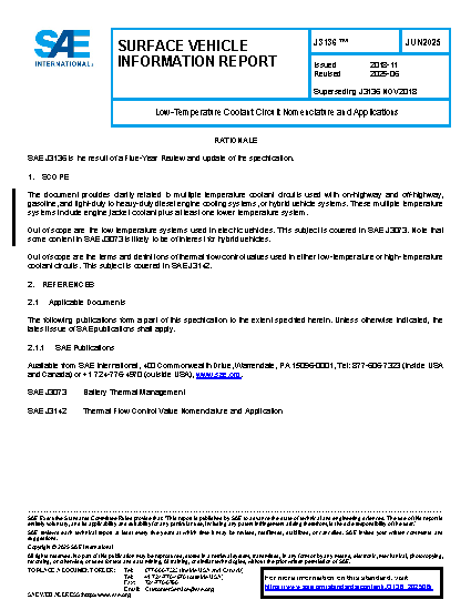 Out of scope are the low temperature systems used in electric vehicles. This subject is covered in SAE J3073. Note that some content in SAE J3073 is likely to be of interest for hybrid vehicles.