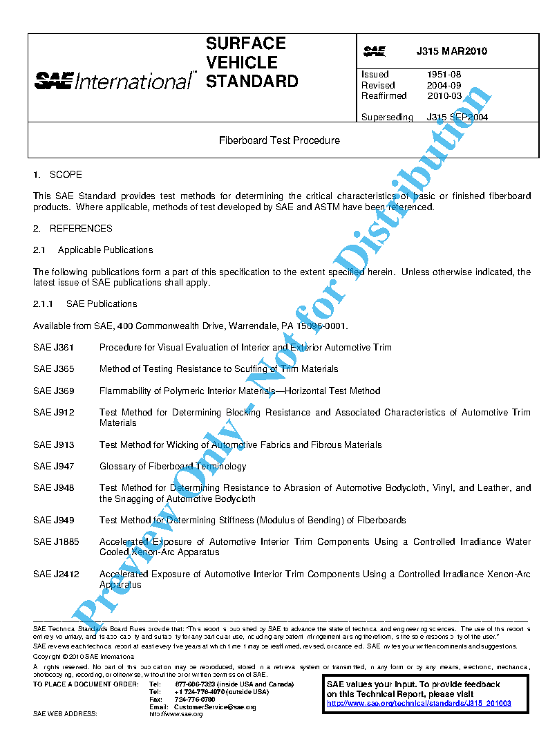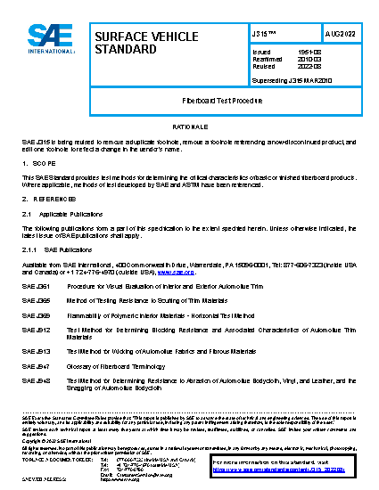 This SAE Standard provides test methods for determining the critical characteristics of basic or finished fiberboard products. Where applicable, methods of test developed by SAE and ASTM have been referenced.