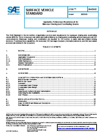 This SAE Standard provides requirements to support applications for the maneuver sharing and coordinating service (MSCS) beyond broadcast of basic safety messages (BSMs). This is to improve road safety and traffic efficiency by sharing and coordinating vehicle maneuvers via vehicle-to-everything (V2X) communications. This document lays out use case scenarios and defines vehicle-to-vehicle (V2V) application protocols, system requirements and message sets for MSCS. The defined message sets for MSCS will result in identifying new message types, data frames, and data elements for SAE J2735.
