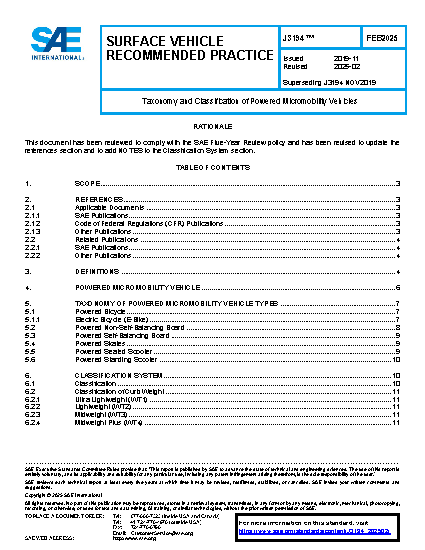 This technical report provides a taxonomy and classification of powered micromobility vehicles. These vehicles may be privately owned or be available via shared- or rental-fleet operations. This technical report does not provide specifications or otherwise impose minimum safety design requirements for powered micromobility vehicles.