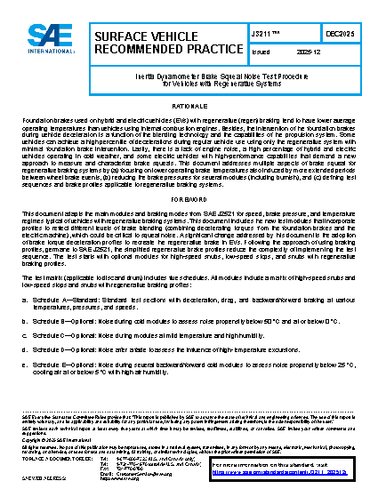The SAE J3211 procedure applies to squeal evaluation for foundation brakes using single-ended inertia dynamometers for friction couples used on vehicles with regenerative braking systems. This document applies to squeal noise occurrences for on-road passenger cars and light trucks with a gross vehicle weight rating of 4536 kg or below and with at least one rechargeable energy storage system as a source for propulsion. The procedure incorporates aspects related to (a) minimum inertia dynamometer capabilities, (b) fixture requirements and setup, and (c) test sequences with emphasis on brake temperatures, brake pressure profiles, and strategies to represent brake blending.