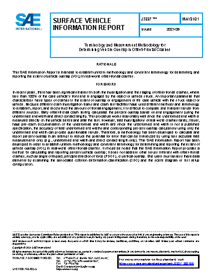 This SAE Information Report establishes procedures and terminology for measuring, calculating, and referencing the percent vehicle overlap for a case vehicle in real-world or staged end plane collisions where the end plane of the case vehicle is engaged at one of the two bumper corners but not both. This SAE Information Report may be applied to rear or front plane impacts.
