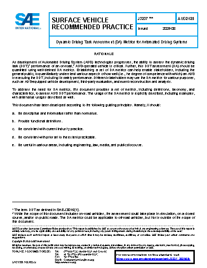 This SAE Recommended Practice provides DA metrics used to quantify the DDT performance of ADS-operated vehicles. 3 Here, the primary focus is on the safety-related DDT performance and includes definitions, taxonomy, characteristics, and usage (along with alternatives) for each metric. DDT performance is a subset of overall operational performance of ADS-operated vehicles. Thus, assessments of DDT Fallback [1], cybersecurity, maintenance, interactions with passengers, etc., while important and could have an indirect impact on the DDT, are out of scope for this document. Note that the DA metrics do not specify the actions and/or maneuvers to be executed by the (ADS-operated) subject vehicle (SV).