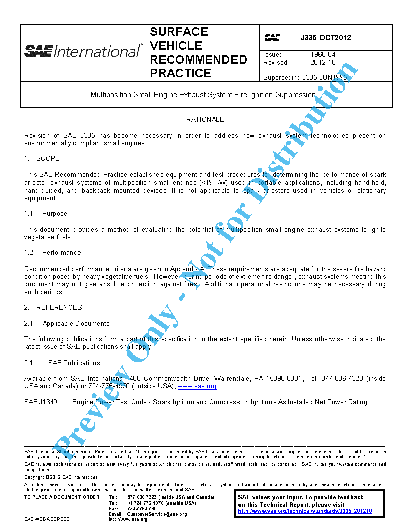 This SAE Recommended Practice establishes equipment and test procedures for determining the performance of spark arrester exhaust systems of multiposition small engines (<19 kW) used in portable applications, including hand-held, hand-guided, and backpack mounted devices. It is not applicable to spark arresters used in vehicles or stationary equipment.