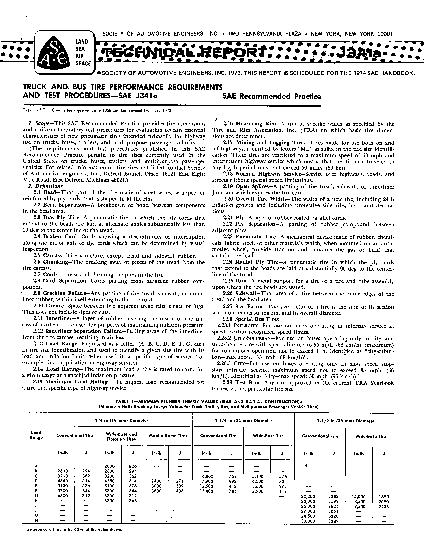 (The requirements and test procedures published in this SAE Recommended Practice pertain to tire sizes currently used in the United States on trucks, buses, trailers, and multipurpose passenger vehicles. For related information on tire sizes not listed, contact Society of Automotive Engineers, Inc., Detroit Branch Office, 18121 East Eight Mile Road, East Detroit, Michigan 48021.)
